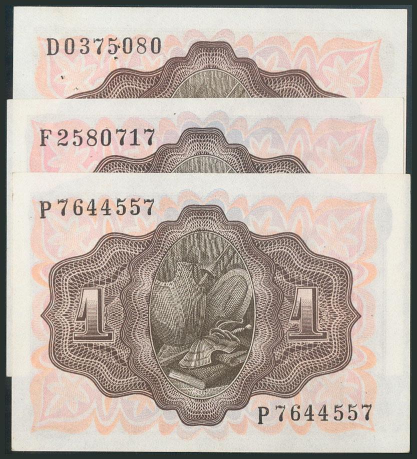 Conjunto de 3 billetes de 1 Peseta, emitidos el 19 de Noviembre de 1951 con las series D, F y P, respectivamente, el de la serie D con marca de grapa (Edifil 2017: 461a). SC/MBC.