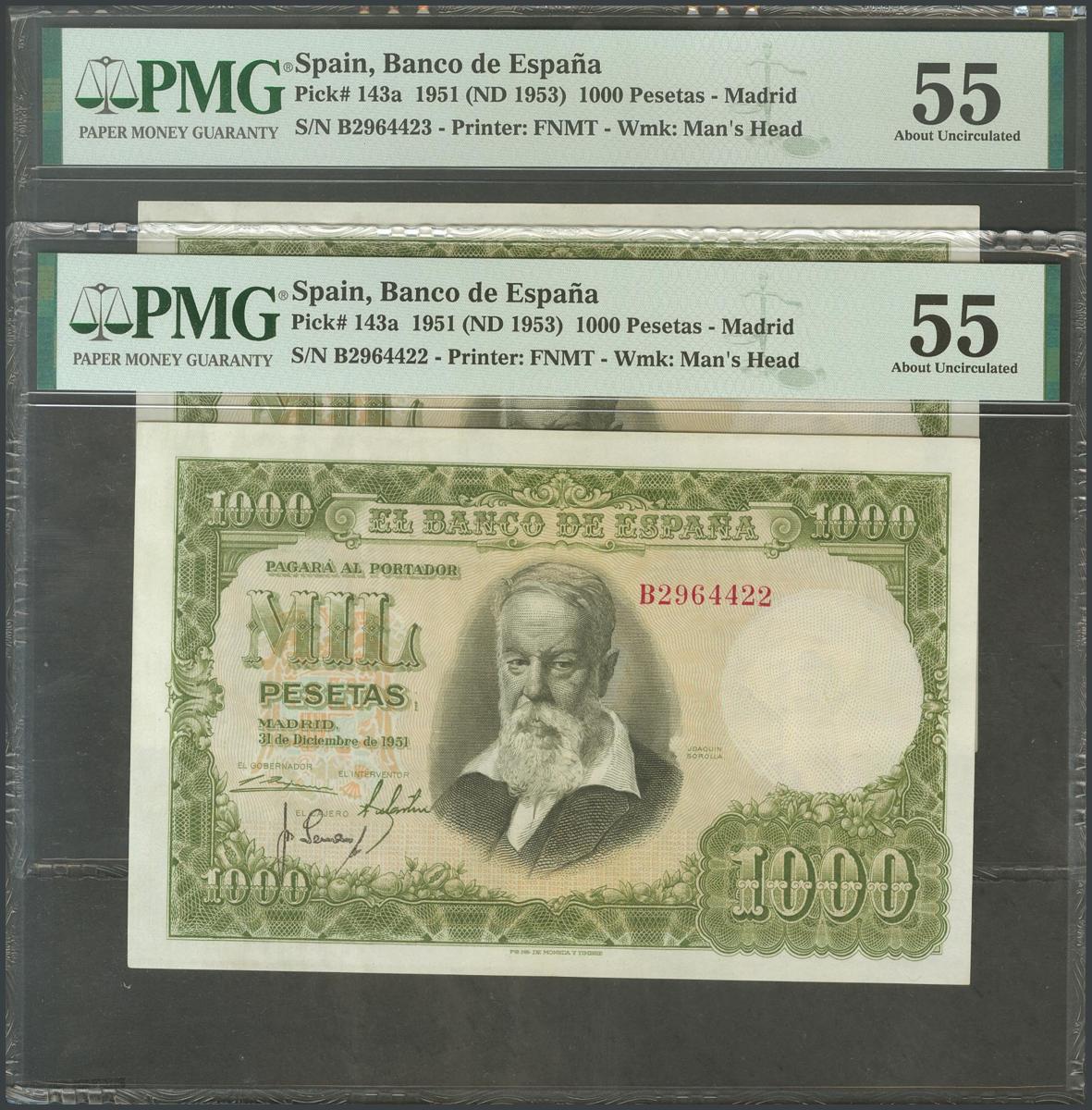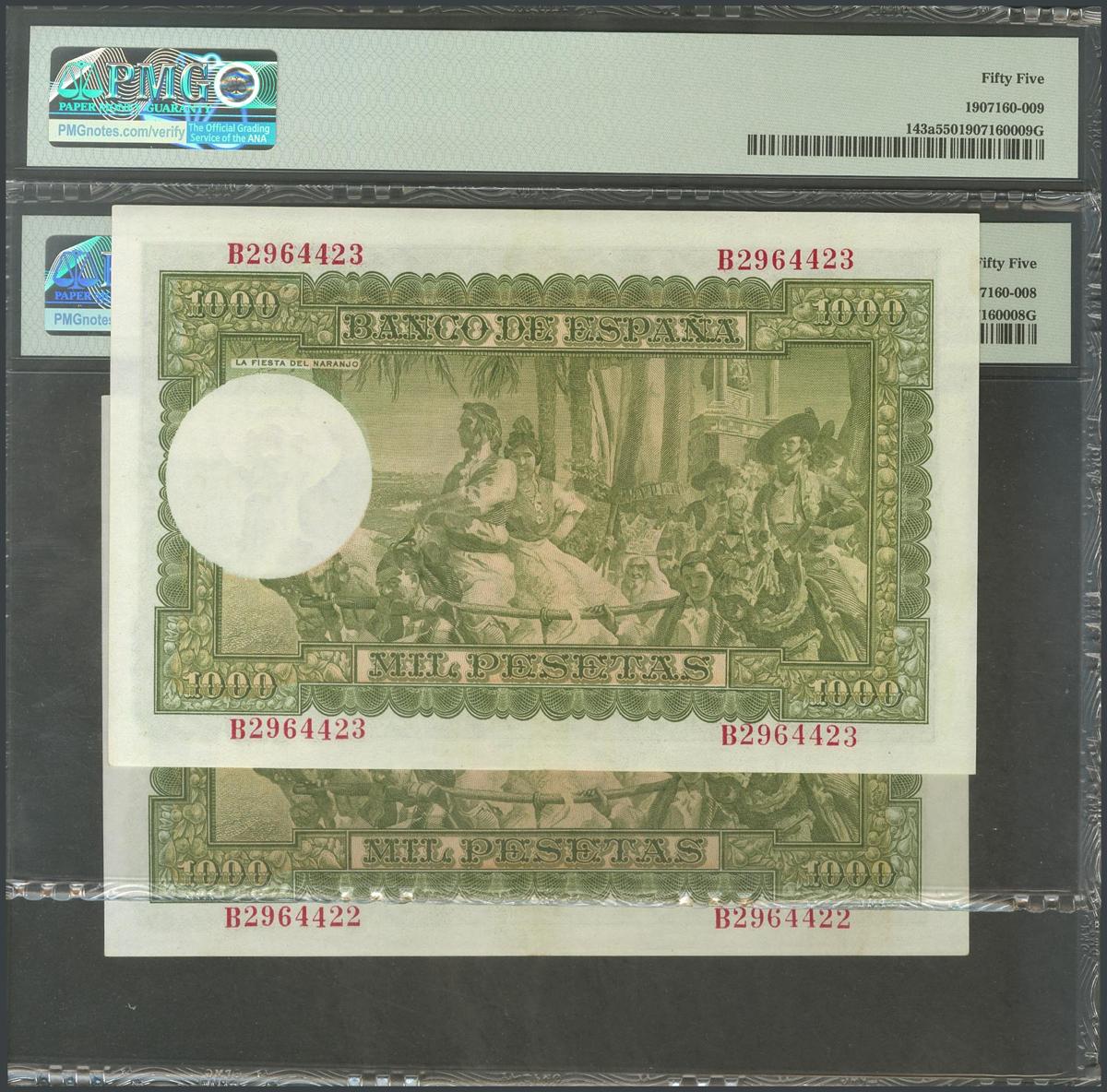 1000 Pesetas. 31 de Diciembre de 1951. Pareja correlativa. Serie B. (Edifil 2017: 463a). Inusual. EBC+. Encapsulados PMG55, ambos.