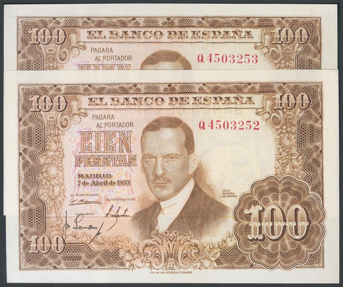 100 Pesetas. 7 de Abril de 1953. Pareja correlativa. Serie Q. (Edifil 2017: 464b). Apresto original. SC/SC-.