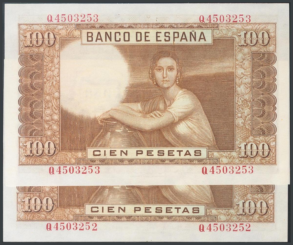 100 Pesetas. 7 de Abril de 1953. Pareja correlativa. Serie Q. (Edifil 2017: 464b). Apresto original. SC/SC-.