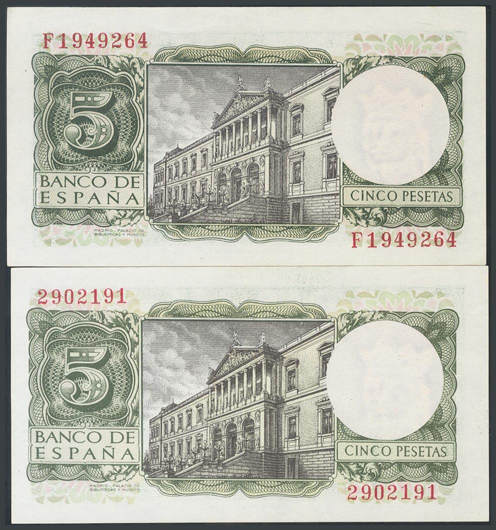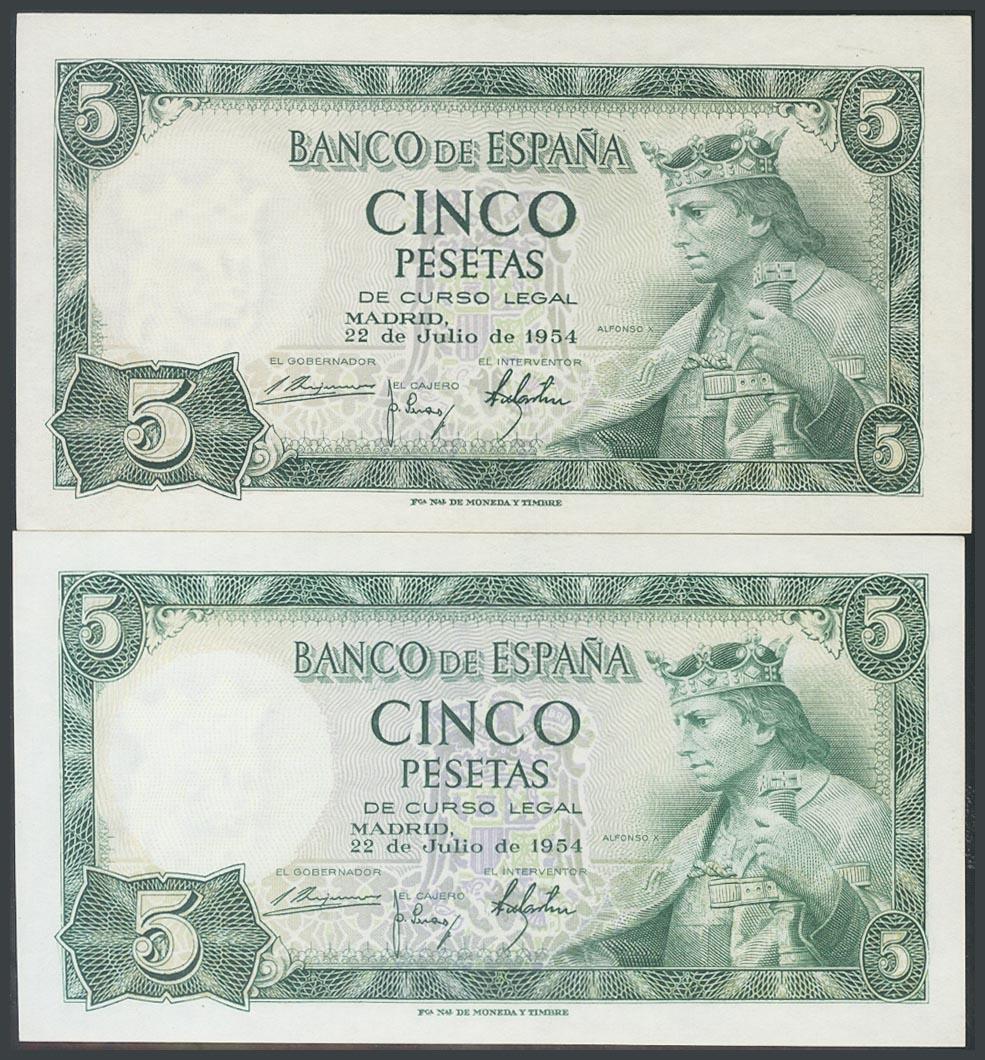 5 Pesetas. 22 de Julio de 1954. Pareja correlativa. Serie F. (Edifil 2017: 466a). SC-.