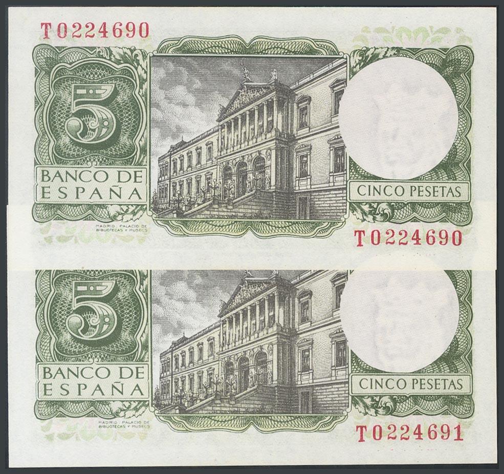 5 Pesetas. 22 de Julio de 1954. Pareja correlativa. Serie T. (Edifil 2017: 466a). SC.