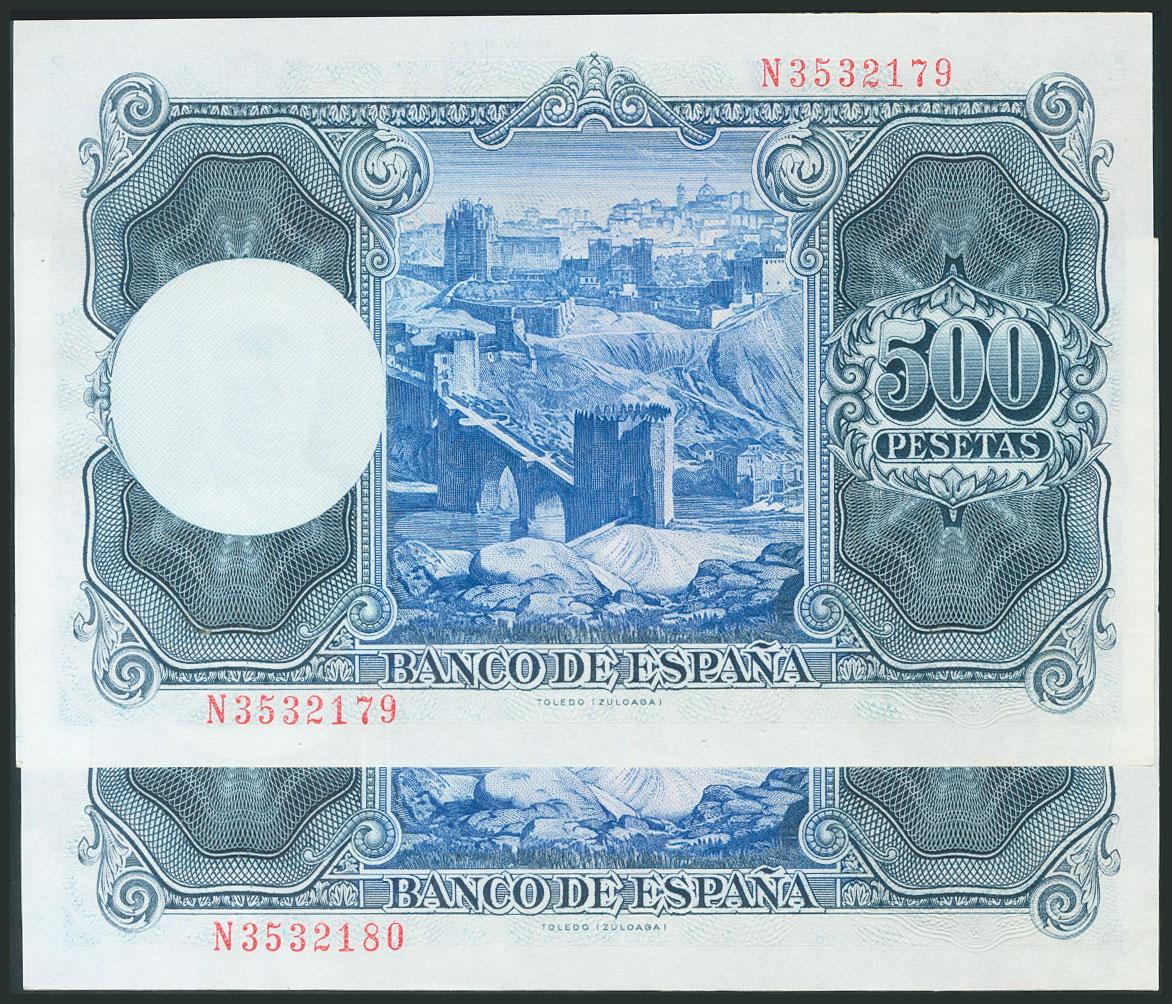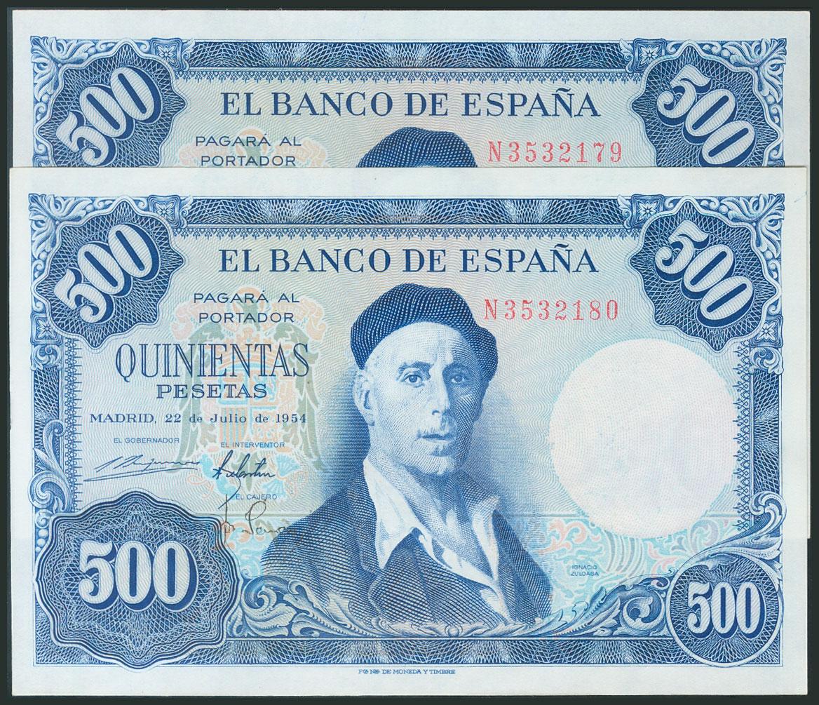 500 Pesetas. 22 de Julio de 1954. Pareja correlativa. Serie N. (Edifil 2017: 468b). SC.