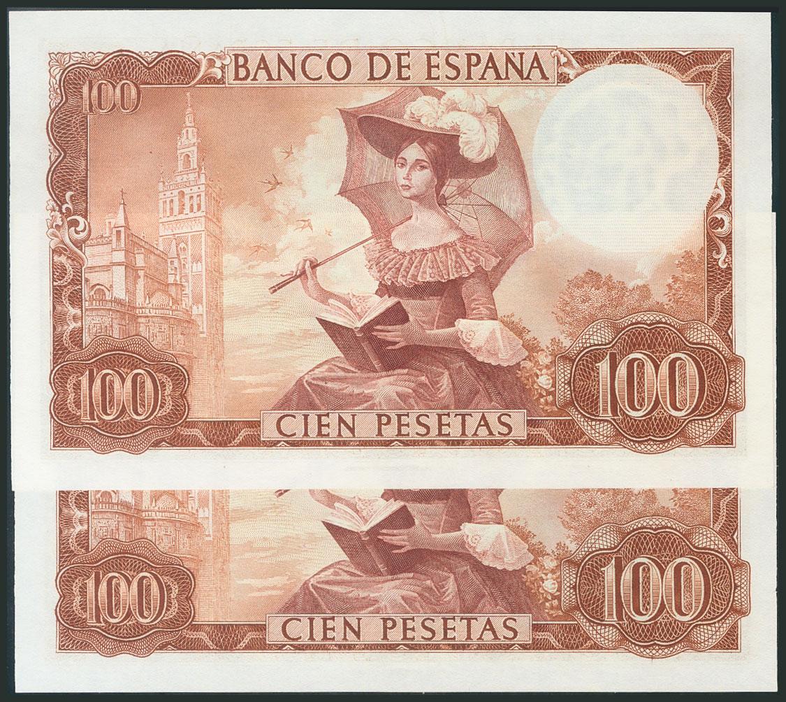 100 Pesetas. 19 de Noviembre de 1965. Pareja correlativa. Sin serie. (Edifil 2017: 470). SC.