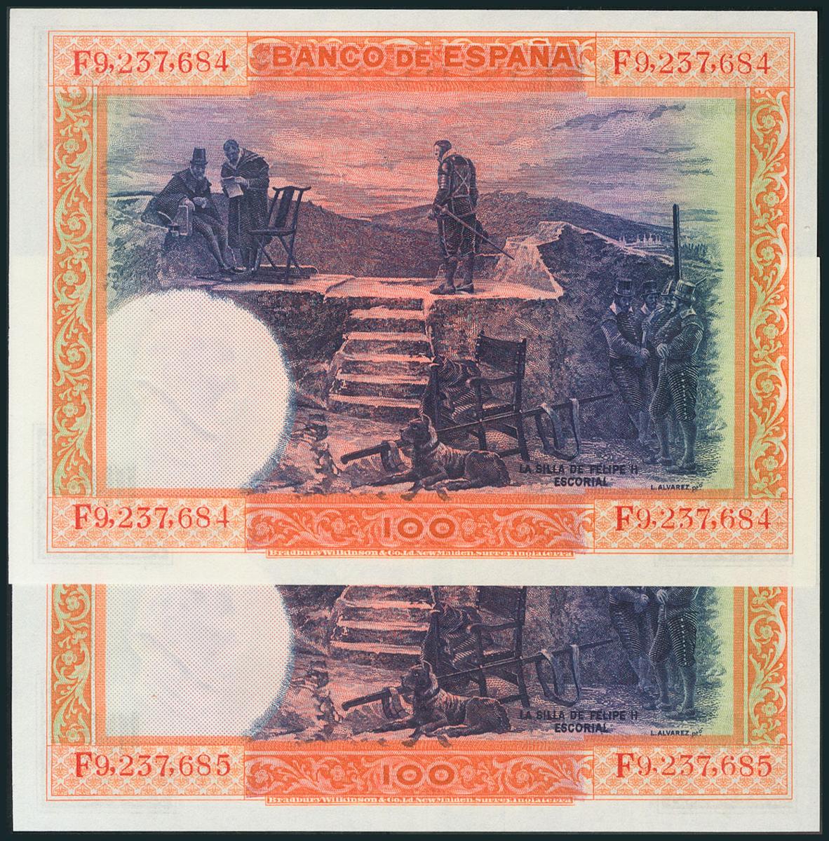 100 Pesetas. 1 de Julio de 1925. Pareja correlativa. Serie F. (Edifil 2017: 350). Apresto original. SC.
