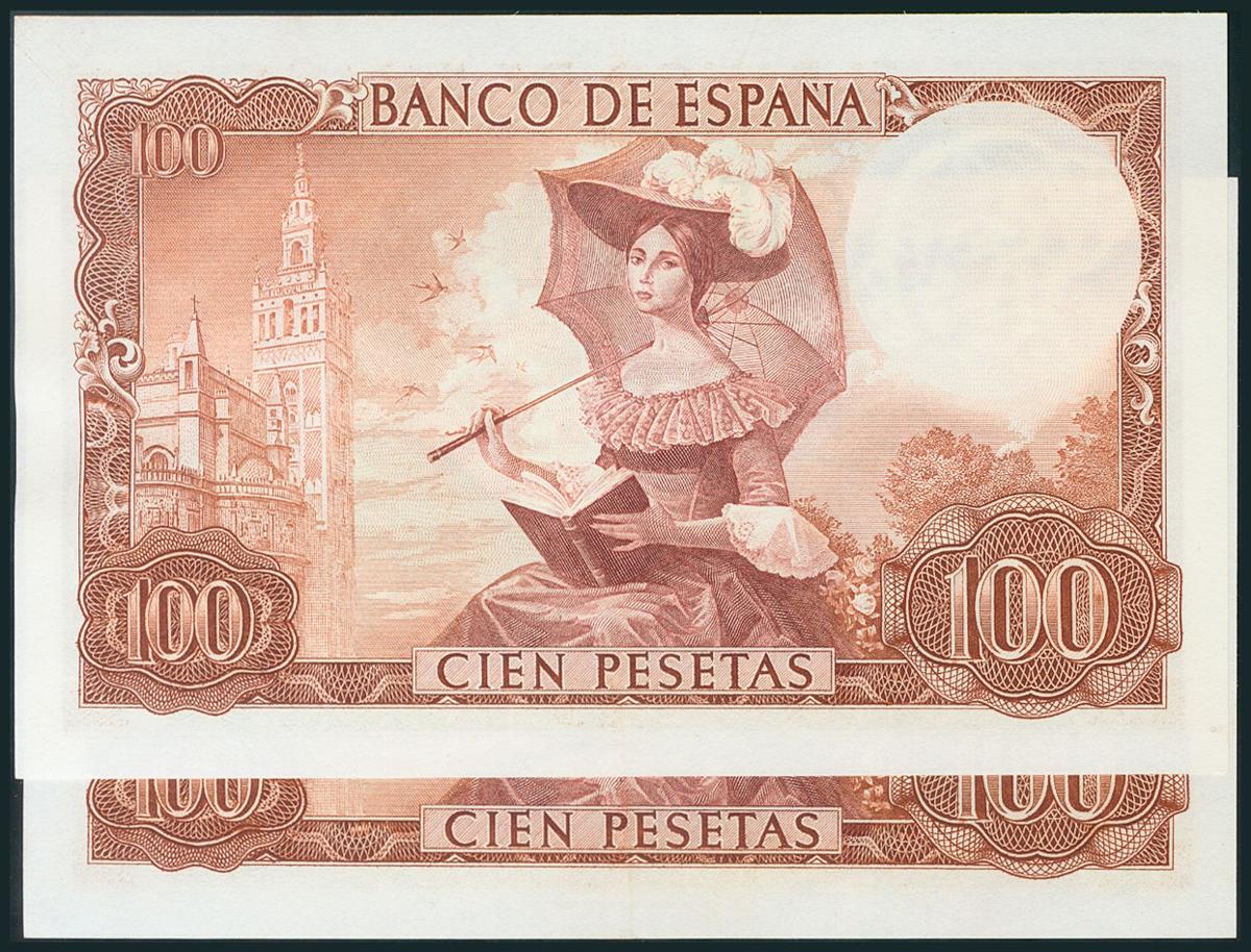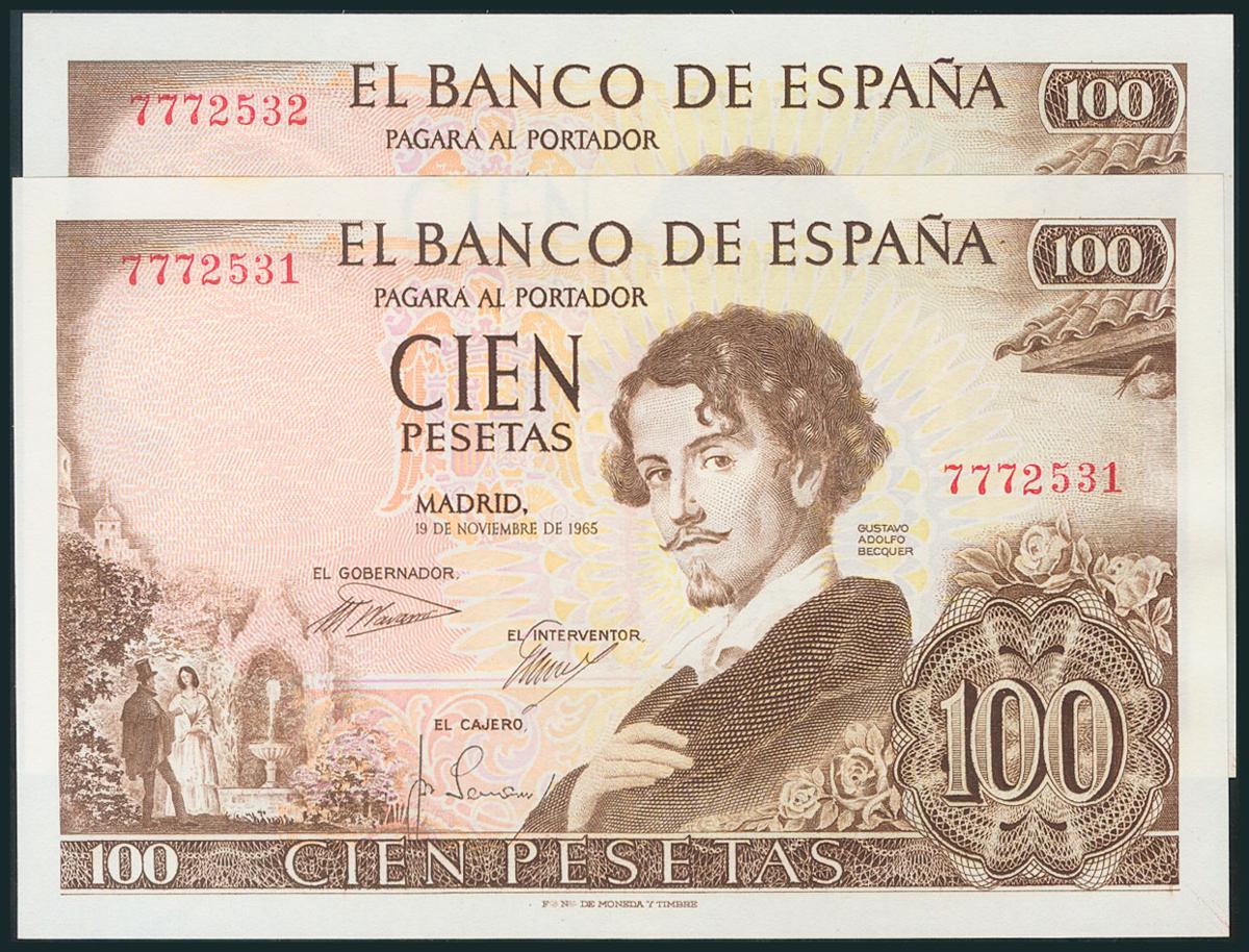 100 Pesetas. 19 de Noviembre de 1965. Pareja correlativa. Sin serie. (Edifil 2017: 470). EBC.