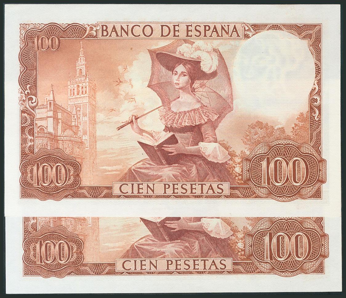 100 Pesetas. 19 de Noviembre de 1965. Pareja correlativa. Serie A. (Edifil 2017: 470a). SC-.