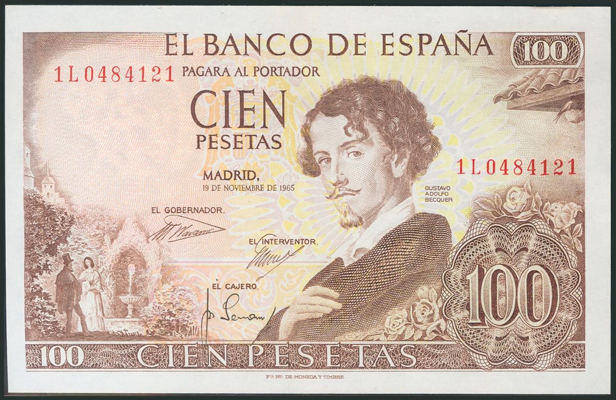 100 Pesetas. 19 de Noviembre de 1965. Serie 1L. (Edifil 2017: 470a). SC-.