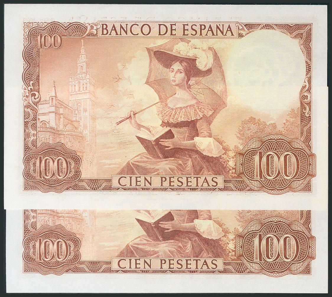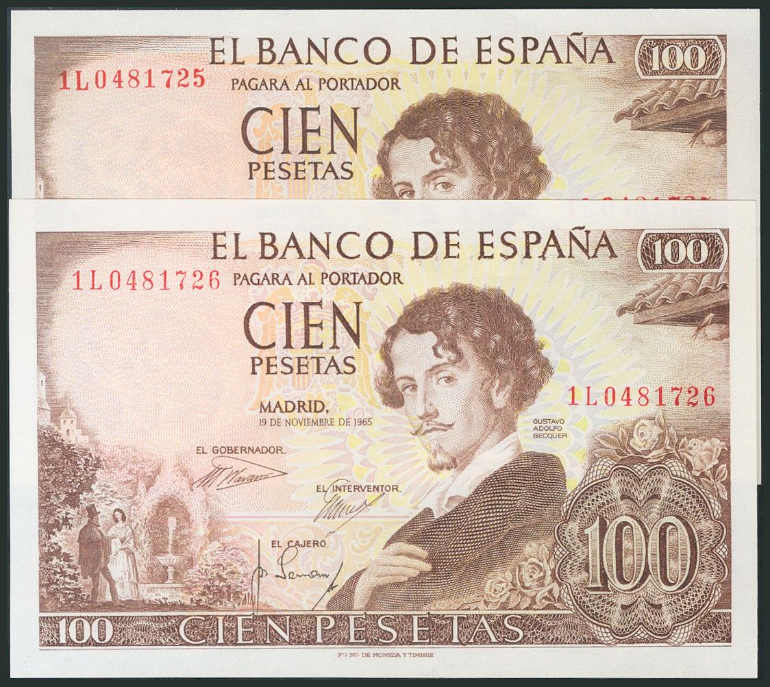 100 Pesetas. 19 de Noviembre de 1965. Pareja correlativa. Serie 1L. (Edifil 2017: 470a). SC.