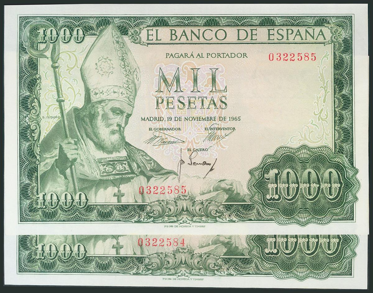 1000 Pesetas. 19 de Noviembre de 1965. Pareja correlativa. Sin serie. (Edifil 2017: 471). Conserva todo su apresto original. EBC+.