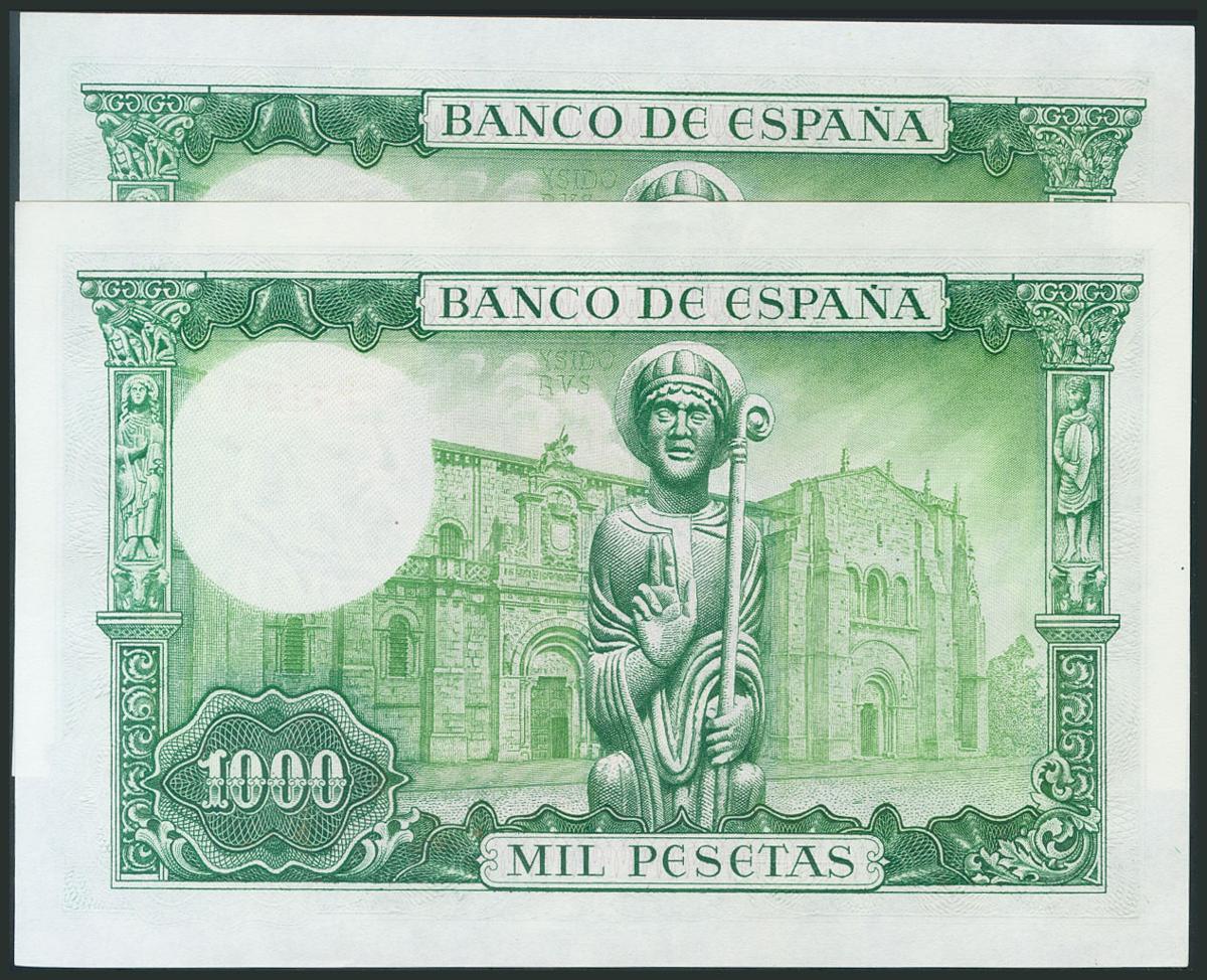 1000 Pesetas. 19 de Noviembre de 1965. Pareja correlativa. Serie F. (Edifil 2017: 471b). Conserva todo su apresto original. SC-.