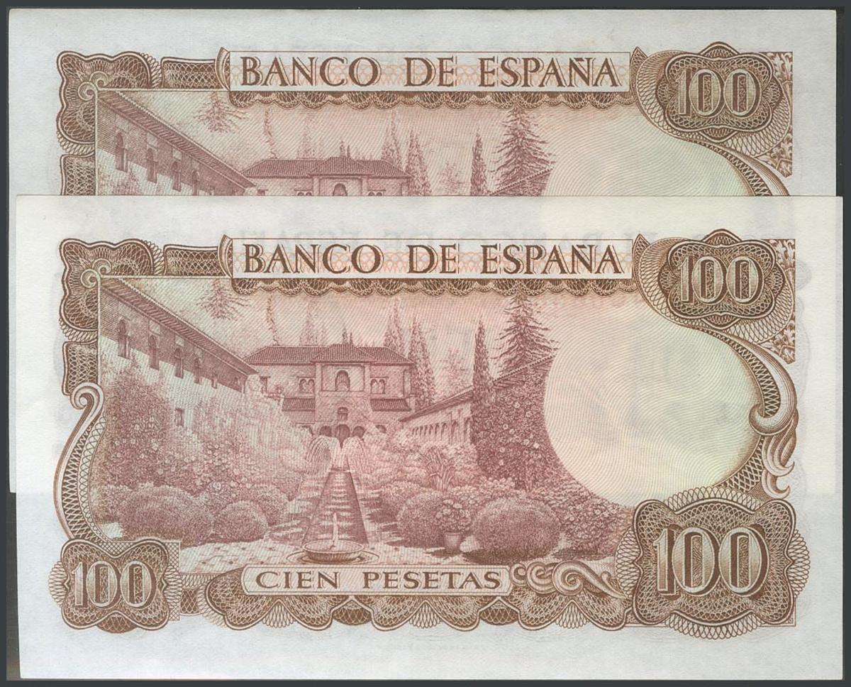 100 Pesetas. 17 de Noviembre de 1970. Pareja correlativa. Serie 9C. (Edifil 2017: 472d). Apresto original. SC.