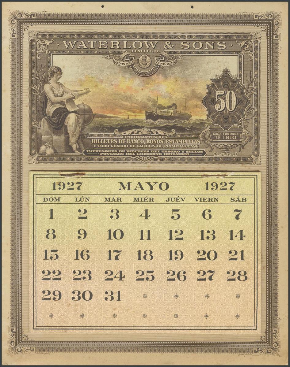 Espectacular calendario del año 1927 (están las hojas desde el mes de mayo) editado e impreso por Waterlow and Sons en Londres, en lengua castellana y con un precioso motivo del estilo y arte de los billetes y documentos de valor que esta imprenta de seguridad producía en los años treinta del siglo pasado para innumerables países y clientes del mundo, entre ellos España. Rarísimo, es el único que conocemos. Muy bien conservado.