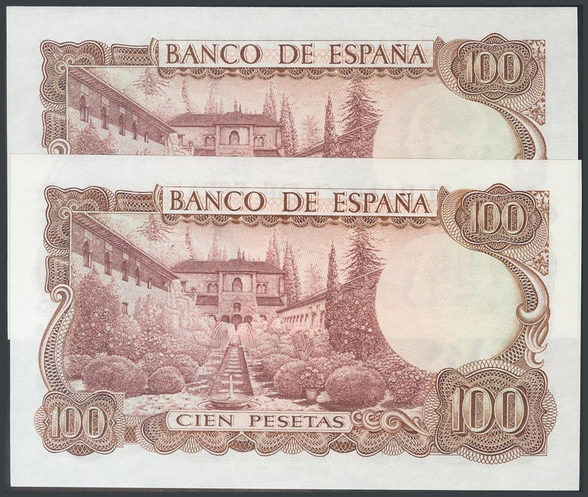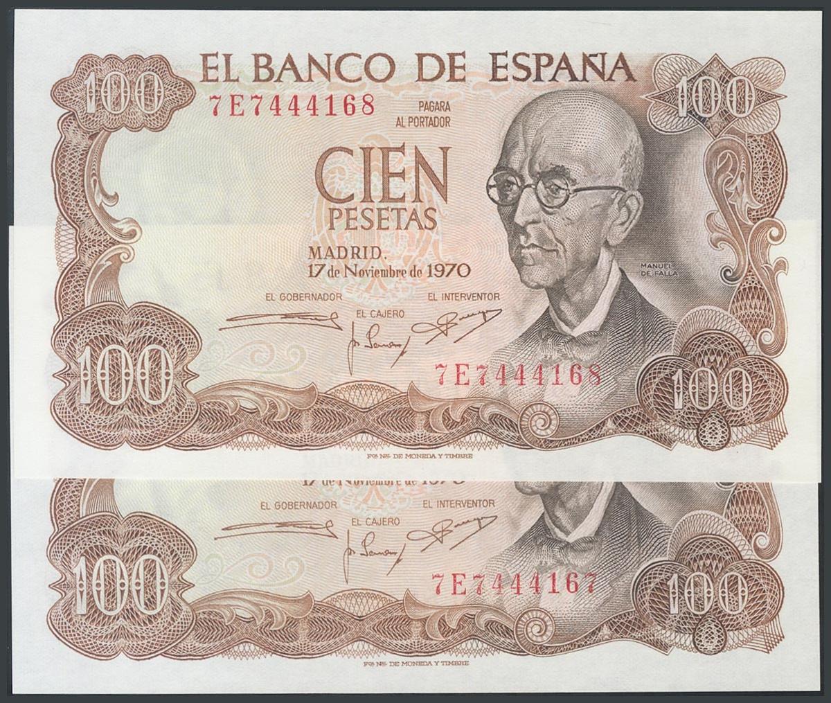 100 Pesetas. 17 de Noviembre de 1970. Pareja correlativa. Serie 7E. (Edifil 2017: 472c). SC.