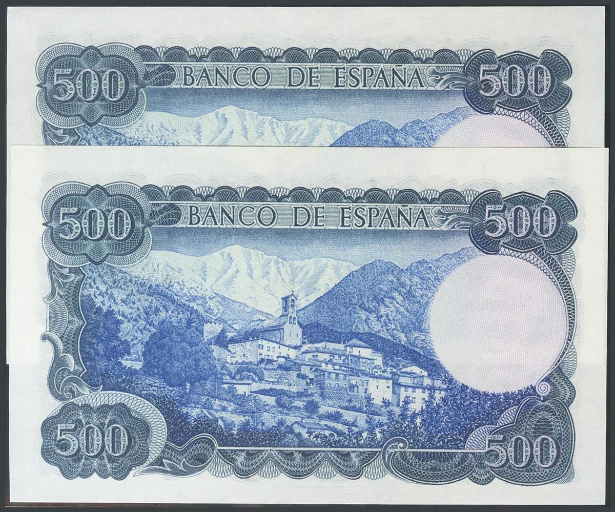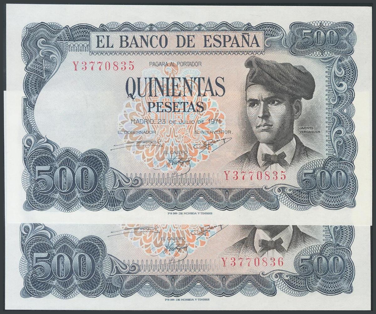 500 Pesetas. 23 de Julio de 1971. Pareja correlativa. Serie Y. (Edifil 2017: 473a). Apresto original. SC.