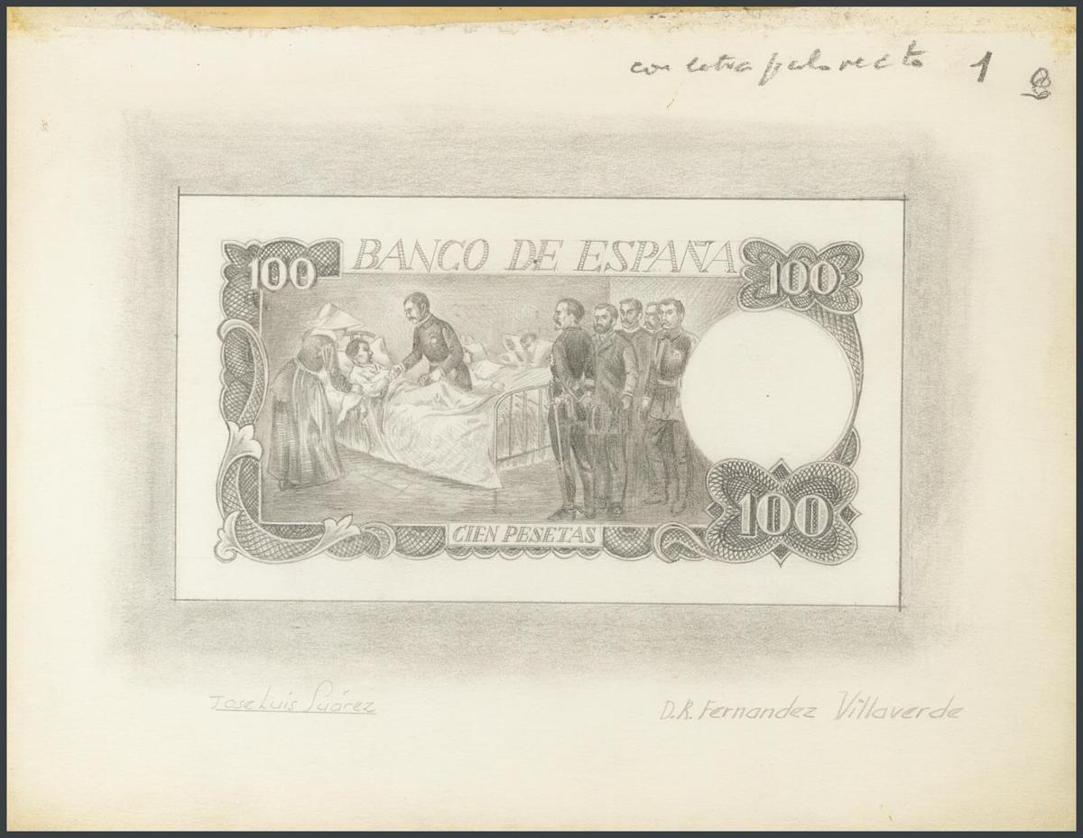(1974ca). Boceto realizado por Jose Luis Suárez sobre lámina de cartón y a lápiz del reverso de un billete de 100 Pesetas dedicado a Don Raimundo Fernández Villaverde (inscripción en la parte inferior del cartón de presentación) que plasma la visita de un grupo de oficiales a un hospital, probablemente tras las victorias de los libertadores cubanos (el catálogo Edifil especializado del año 2017 ilustra en la página 173 una prueba del anverso, con el mismo arte y con la numeración NE68, dedicada a Don Raimundo Fernández Villaverde; este diseño de reverso se complementa con el catalogado). Espectacular y pieza única.