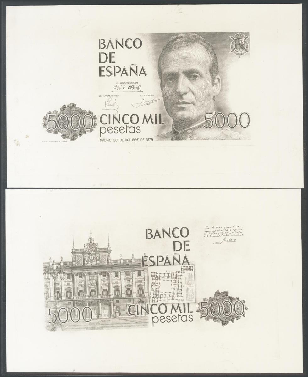 Conjunto de 2 pruebas definitivas de grabado en color negro del anverso y reverso del billete de 5000 Pesetas, emitido el 23 de Octubre de 1979. (Edifil 2017: 478). Piezas de enorme espectacularidad y rareza.