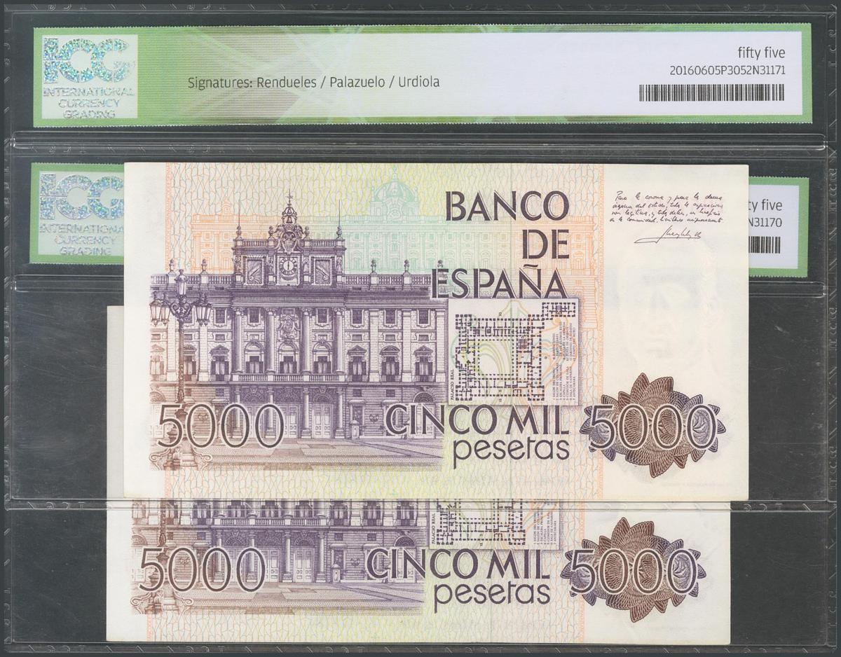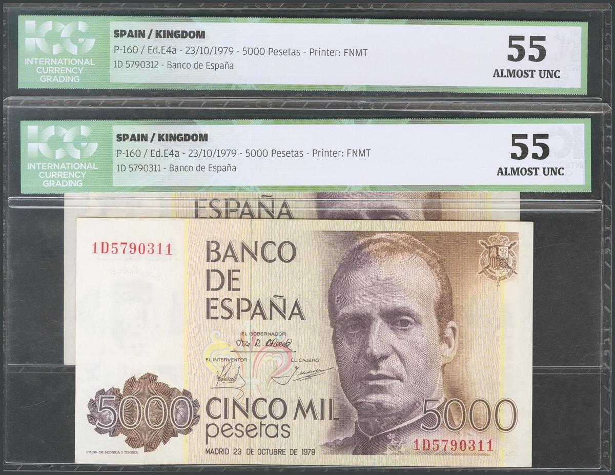 5000 Pesetas. 23 de Octubre de 1979. Pareja correlativa. Serie 1D. (Edifil 2017: 478a). Encapsulado ICG55. EBC+.