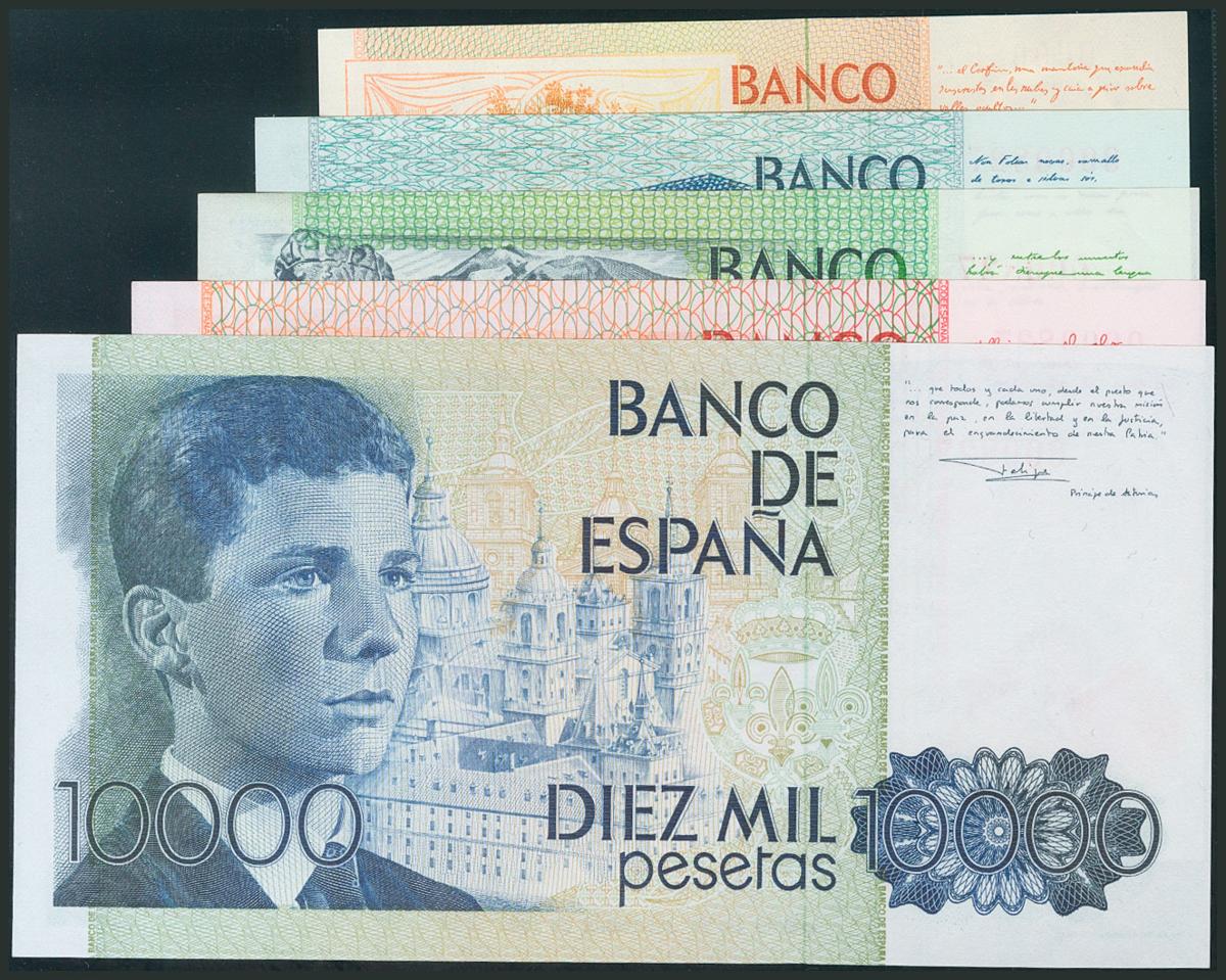 Conjunto de 5 billetes del Banco de España de 200 Pesetas, 500 Pesetas, 1000 Pesetas, 2000 Pesetas y 10000 Pesetas, todos los billetes emitidos entre 1979 y 1985 (a excepción del de 5000 Pesetas, que precisamente el catálogo Edifil no lo incorpora como serie completa), todos sin serie y con la misma numeración baja 0000827. (Edifil 2017: 480, 476, 477, 479, 481). SC.