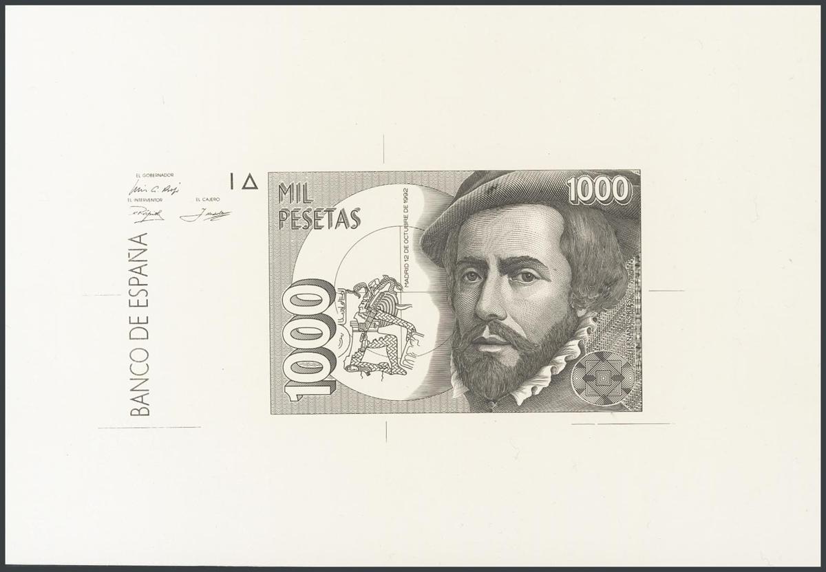 Prueba de grabado en color negro del anverso del billete de 1000 Pesetas, emitido el 12 de Octubre de 1992 (tipo II, párpado oscuro). (Edifil 2017: 483a). Pieza de enorme espectacularidad y rareza.
