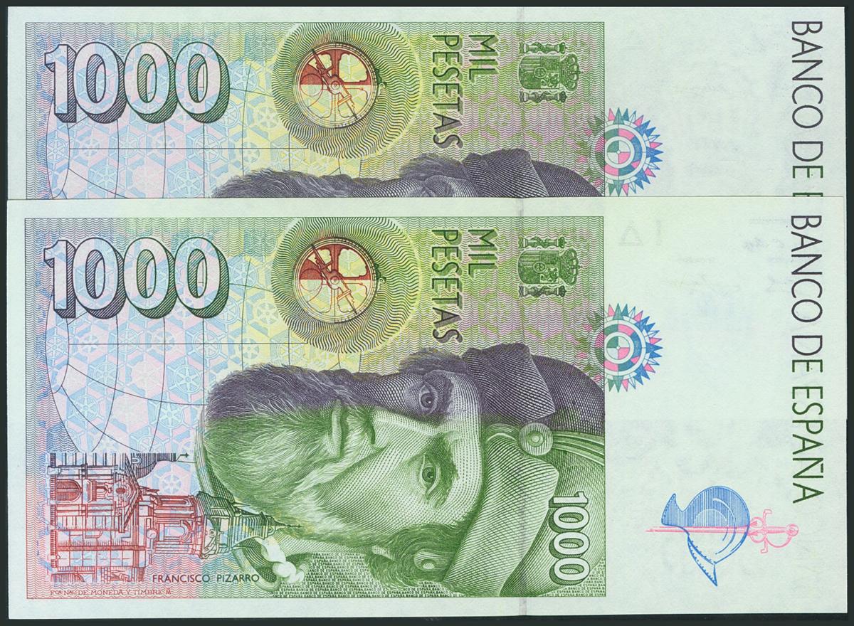 1000 Pesetas. 12 de Octubre de 1992. Pareja correlativa. Tipo I. Sin serie y numeración muy baja. (Edifil 2017: 483). SC.