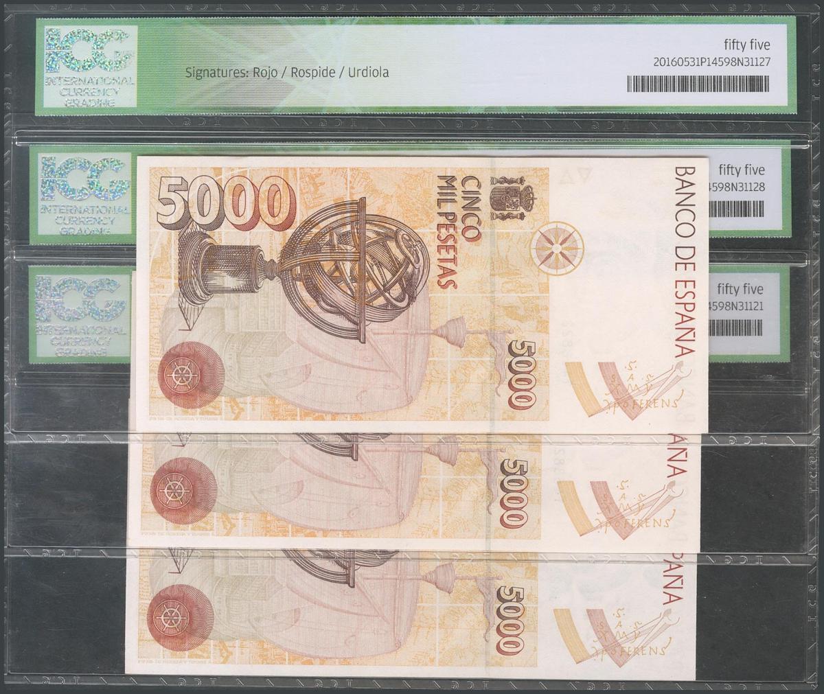 5000 Pesetas. 10 de Octubre de 1992. Trío correlativo. Sin serie. (Edifil 2017: 484). Encapsulados ICG55, ambos. EBC+.