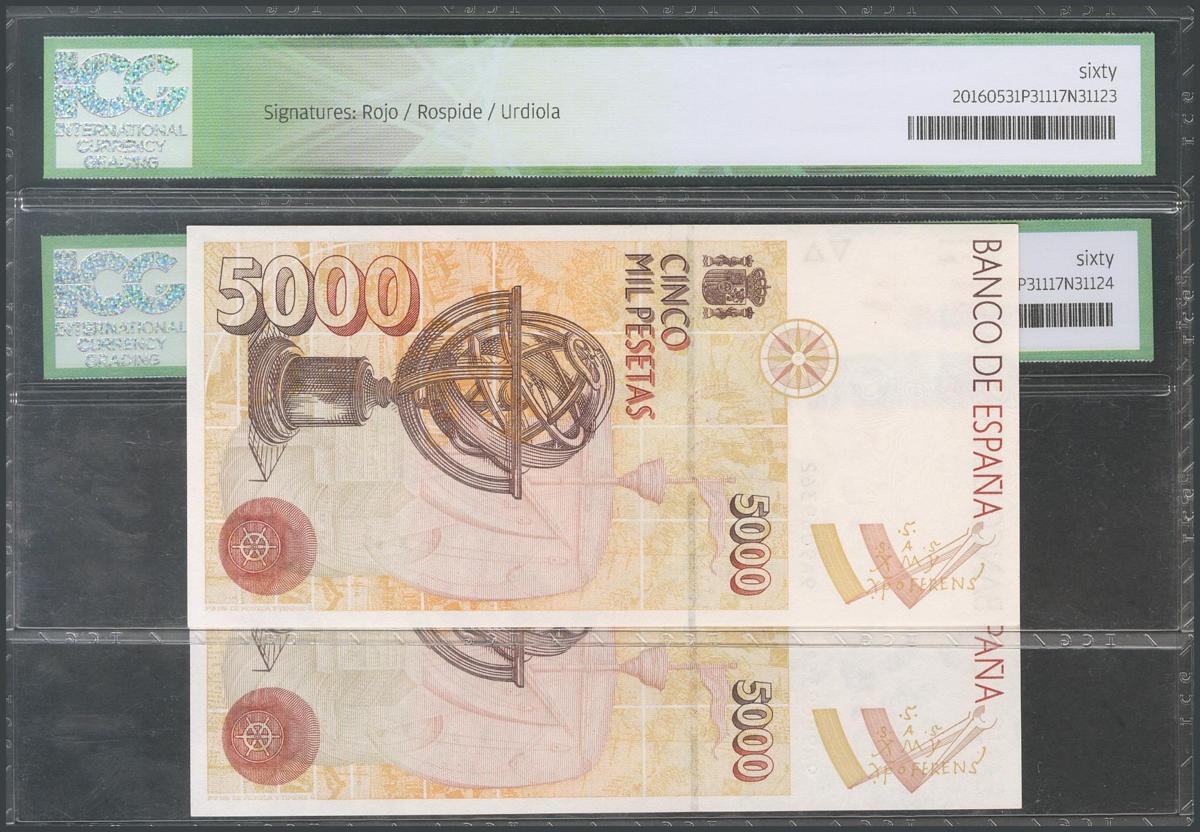 5000 Pesetas. 12 de Octubre de 1992. Pareja correlativa. Serie 9A, respectivamente. (Edifil 2017: 484b). Encapsulados ICG60, ambos. SC-.