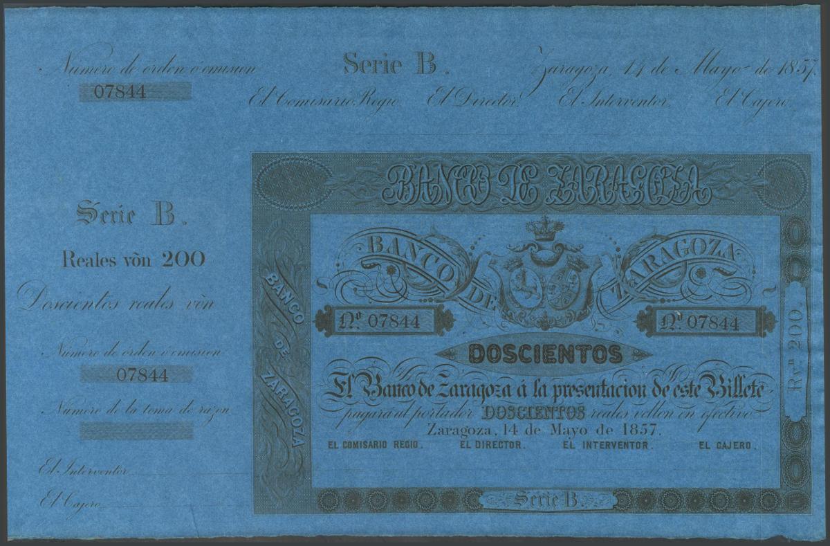 200 Reales. 14 de Mayo de 1857. Banco de Zaragoza. Serie B y con matriz. (Edifil 2017: 127). SC-.