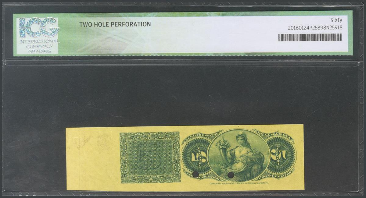 CUBA. 5 Centavos. 6 de Agosto de 1883. Serie H. Specimen, numeración 00000 y con matriz a la derecha. (Edifil 2017: 43). Rarísimo. Encapsulado ICG60. SC-.
