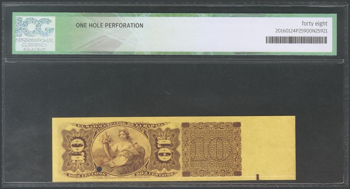 CUBA. 10 Centavos. 6 de Agosto de 1883. Serie G. Specimen, numeración 000000 y con matriz a la izquierda. (Edifil 2017: 46, Echenagusía: 31b). Rarísimo. Encapsulado ICG48. EBC.