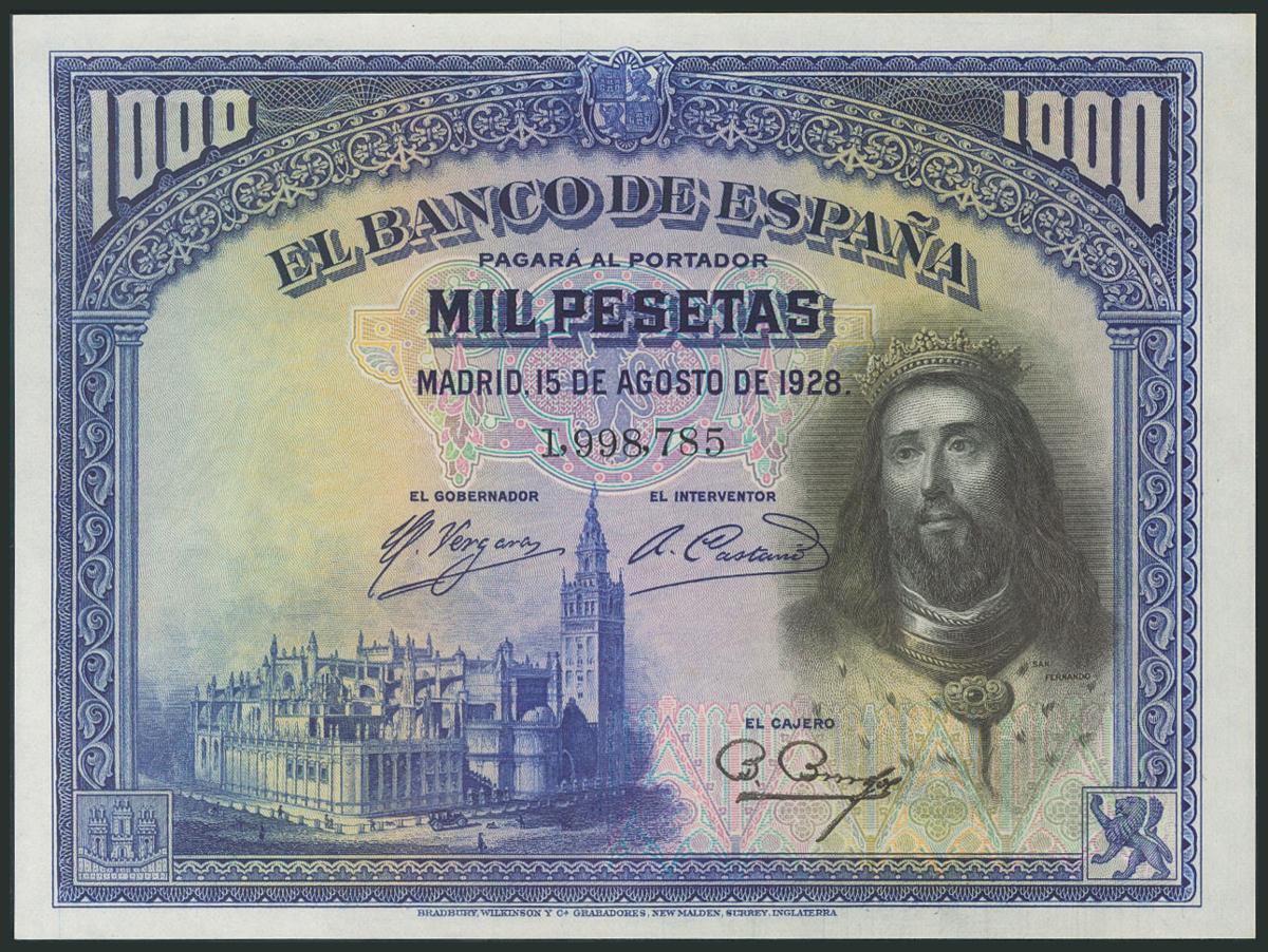 1000 Pesetas. 15 de Agosto de 1928. Sin serie. (Edifil 2017: 357). Apresto original. SC.