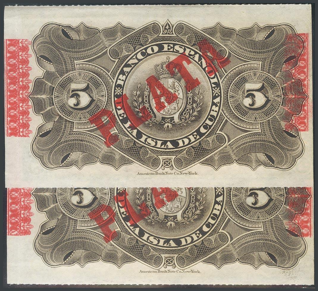 BANCO ESPAÑOL DE LA ISLA DE CUBA. 5 Pesos. 15 de Mayo de 1896. Pareja correlativa. Sobrecarga PLATA. (Edifil 2017: 81). SC.