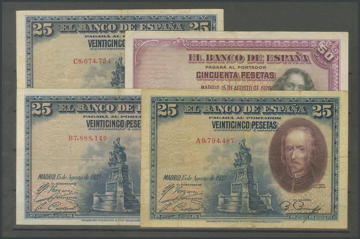 Conjunto de 4 billetes del Banco de España, 3 de 25 Pesetas emitido el 15 de Agosto de 1928 (Edifil 2017: 336) y el 50 Pesetas emitido el 15 de Agosto de 1928 (Edifil 2017: 340), todos ellos con el sello Gobierno Provisional de la República 14 Abril 1931 sobre billetes republicanos. MBC.