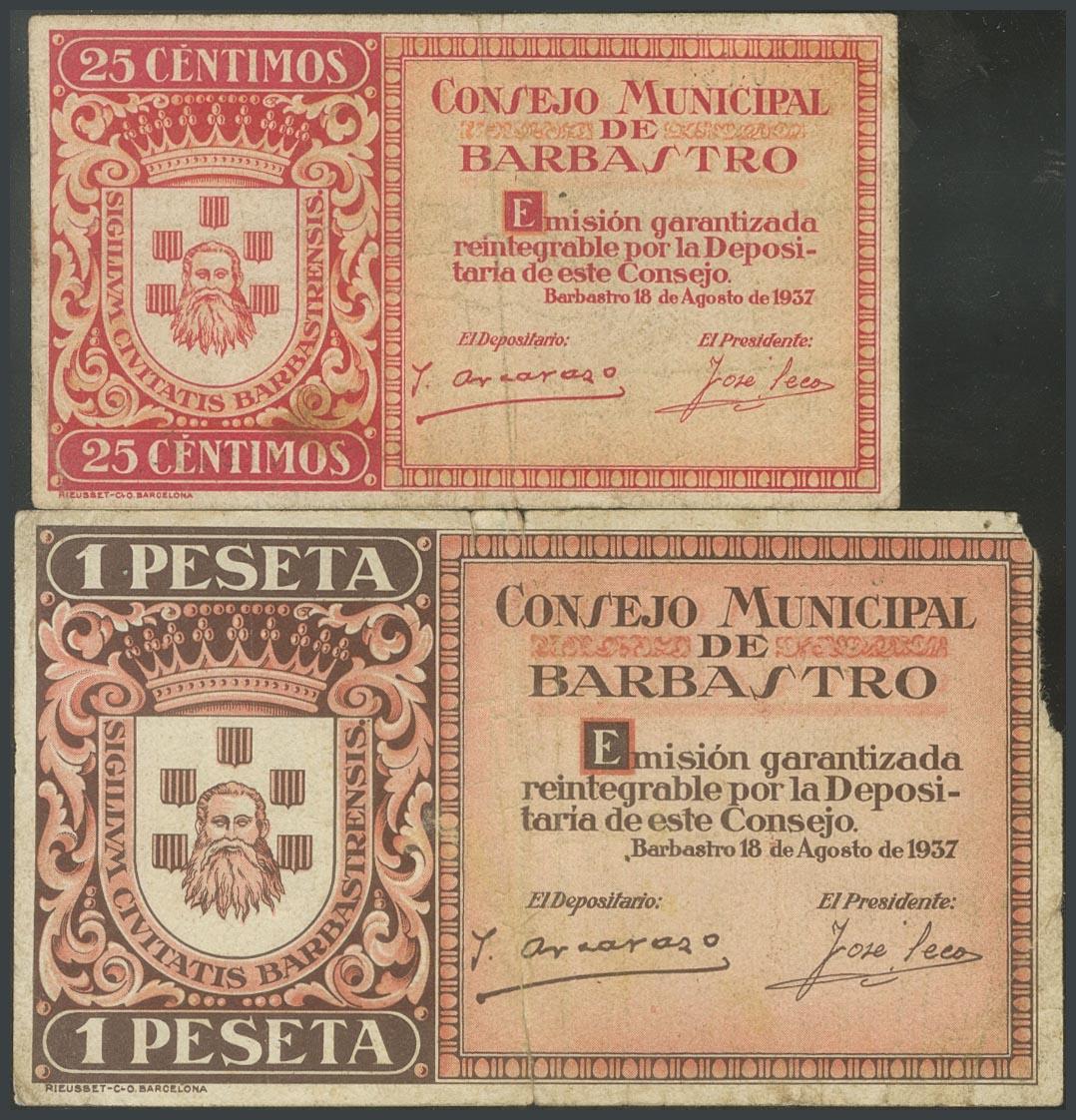 BARBASTRO (HUESCA). 25 Céntimos y 1 Peseta. 18 de Agosto de 1937. Serie A y C, respectivamente. (González: 880, 882). MBC/RC.