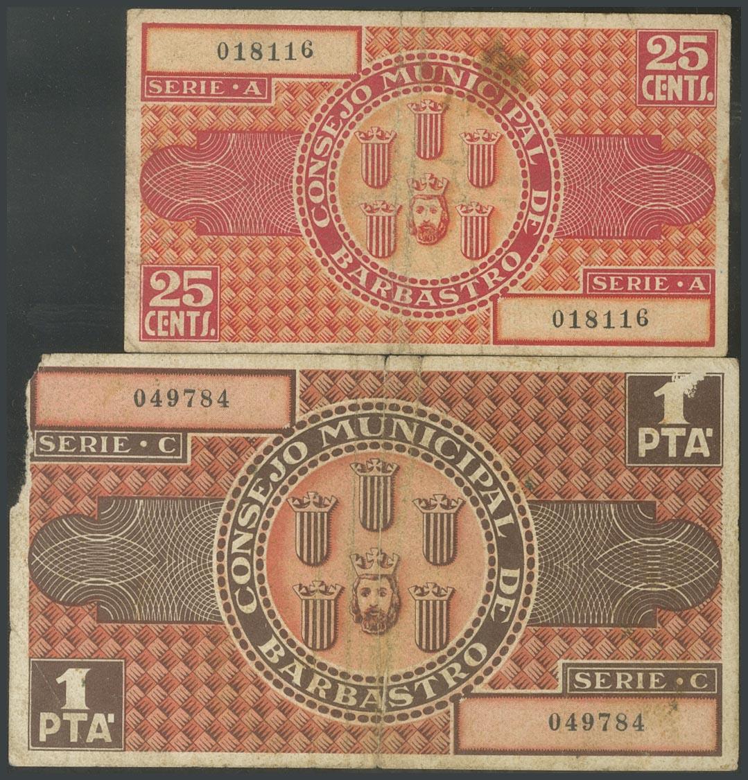 BARBASTRO (HUESCA). 25 Céntimos y 1 Peseta. 18 de Agosto de 1937. Serie A y C, respectivamente. (González: 880, 882). MBC/RC.