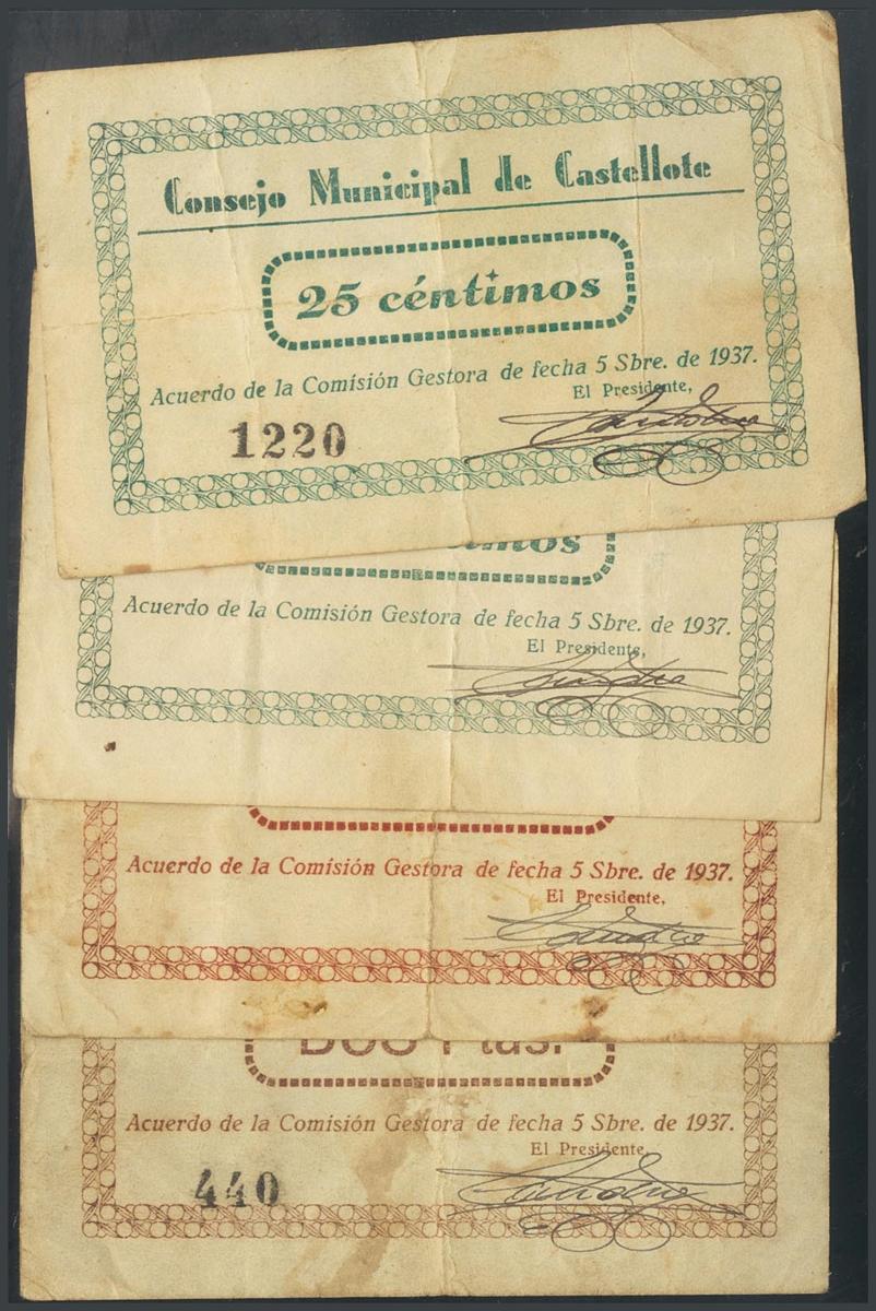 CASTELLOTE (TERUEL). 25 Céntimos, 50 Céntimos, 1 Peseta y 2 Pesetas. 5 de Septiembre de 1937. (González: 1791/94). Rara serie completa. MBC.