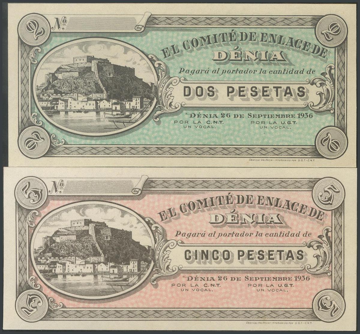 DENIA (ALICANTE). 2 Pesetas y 5 Pesetas. 26 de septiembre de 1937. (González: 2212, 2214). SC.