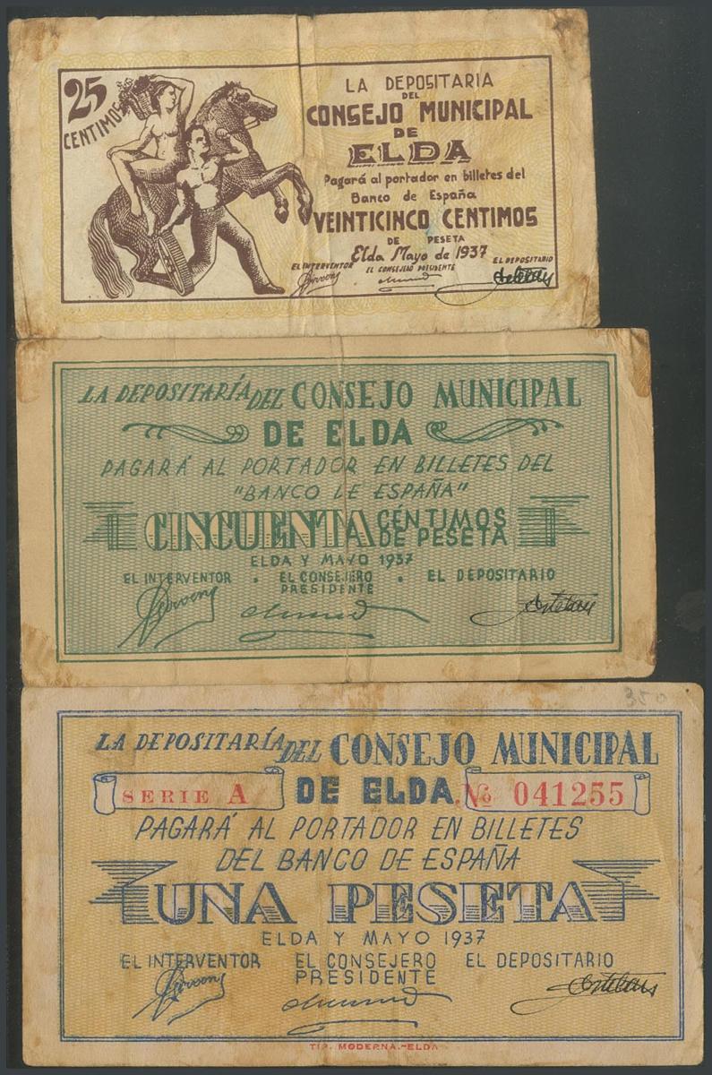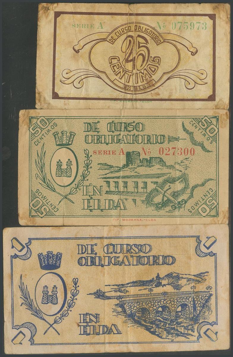 ELDA (ALICANTE). 25 Céntimos, 50 Céntimos y 1 Peseta. Mayo 1937. Serie A, los tres. (González: 2291/93). Inusuales. MBC.