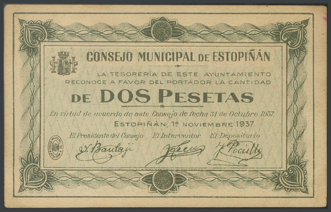 ESTOPIÑAN (HUESCA). 2 Pesetas. 1 de Noviembre de 1937. (González: 2386). Muy raro. EBC.