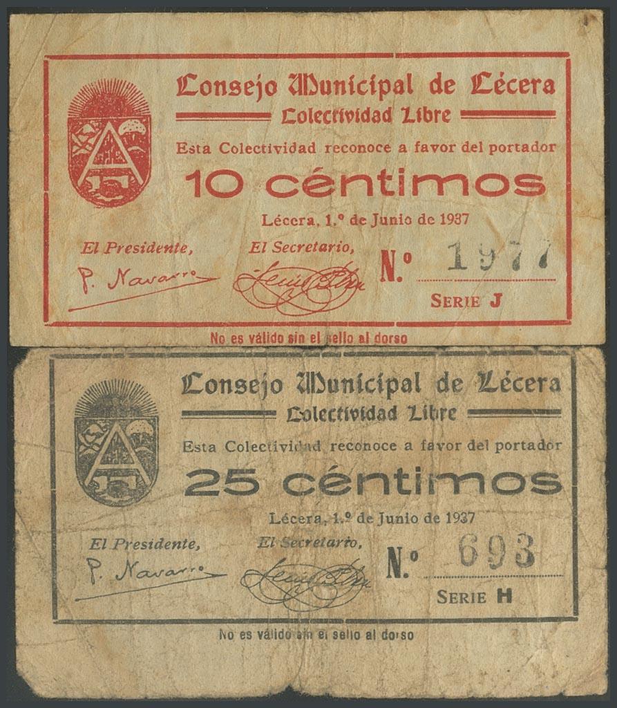 LECERA (ZARAGOZA). 10 Céntimos y 25 Céntimos. 1 de Junio de 1937. Serie J y H, respectivamente. (González: 3121, 3123). Inusuales. BC/MBC-.