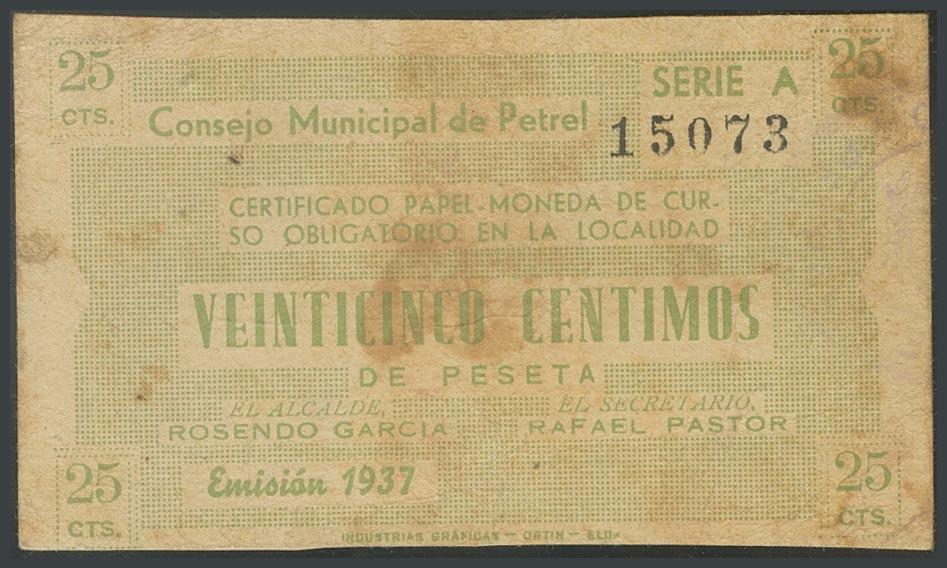 PETREL (ALICANTE). 25 Céntimos. (1937ca). Serie A. (González: 4157). MBC.