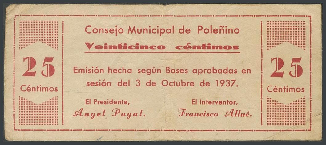 POLEÑINO (HUESCA). 25 Céntimos. 3 de Octubre de 1937. (González: 4223). Raro. MBC.