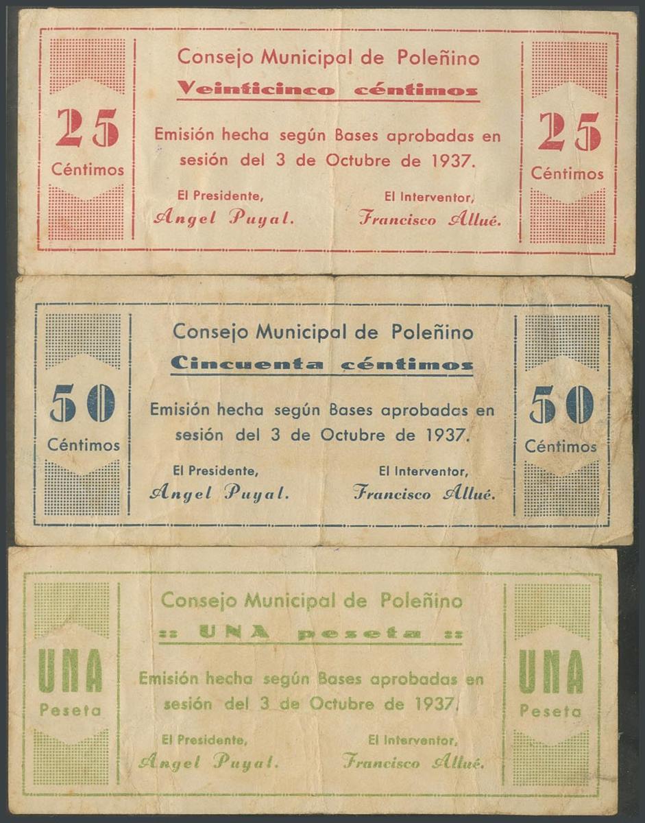 POLEÑINO (HUESCA). 25 Céntimos, 50 Céntimos y 1 Peseta. 3 de Octubre de 1937. (González: 4223/25). Rara serie completa. MBC-.