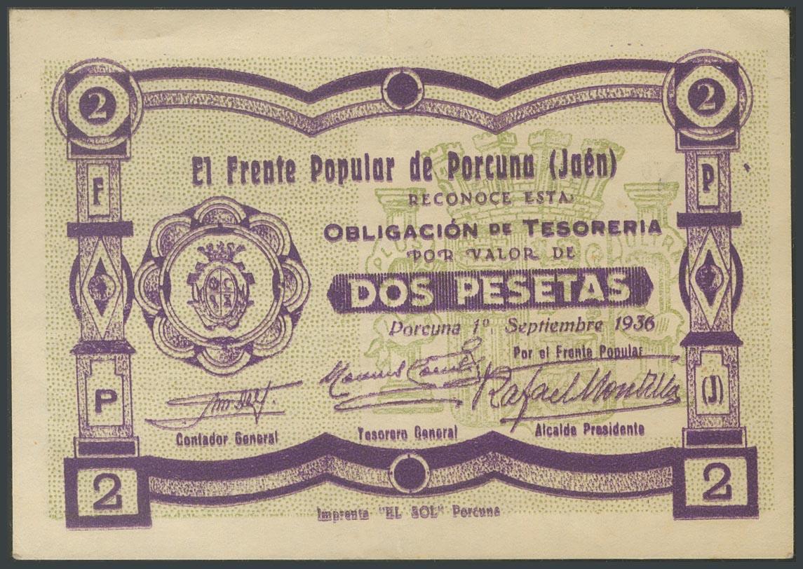 PORCUNA (JAEN). 2 Pesetas. 1 de Septiembre de 1936. (González: 4244). Inusual. EBC.