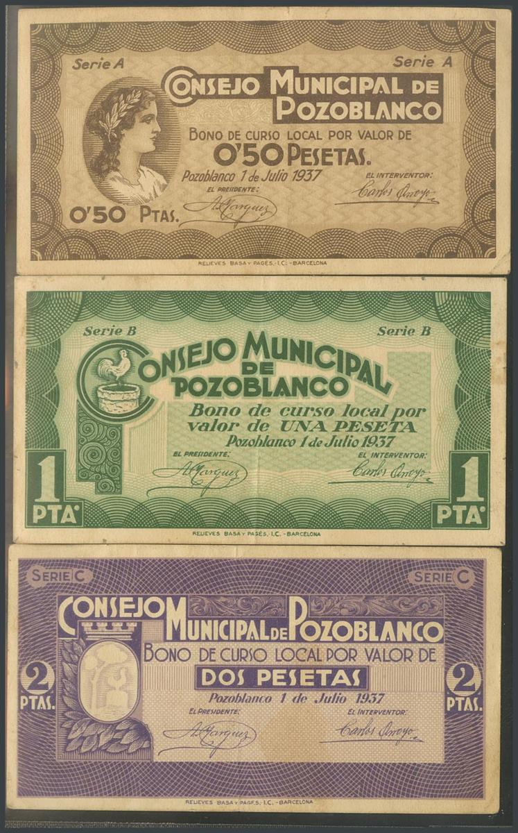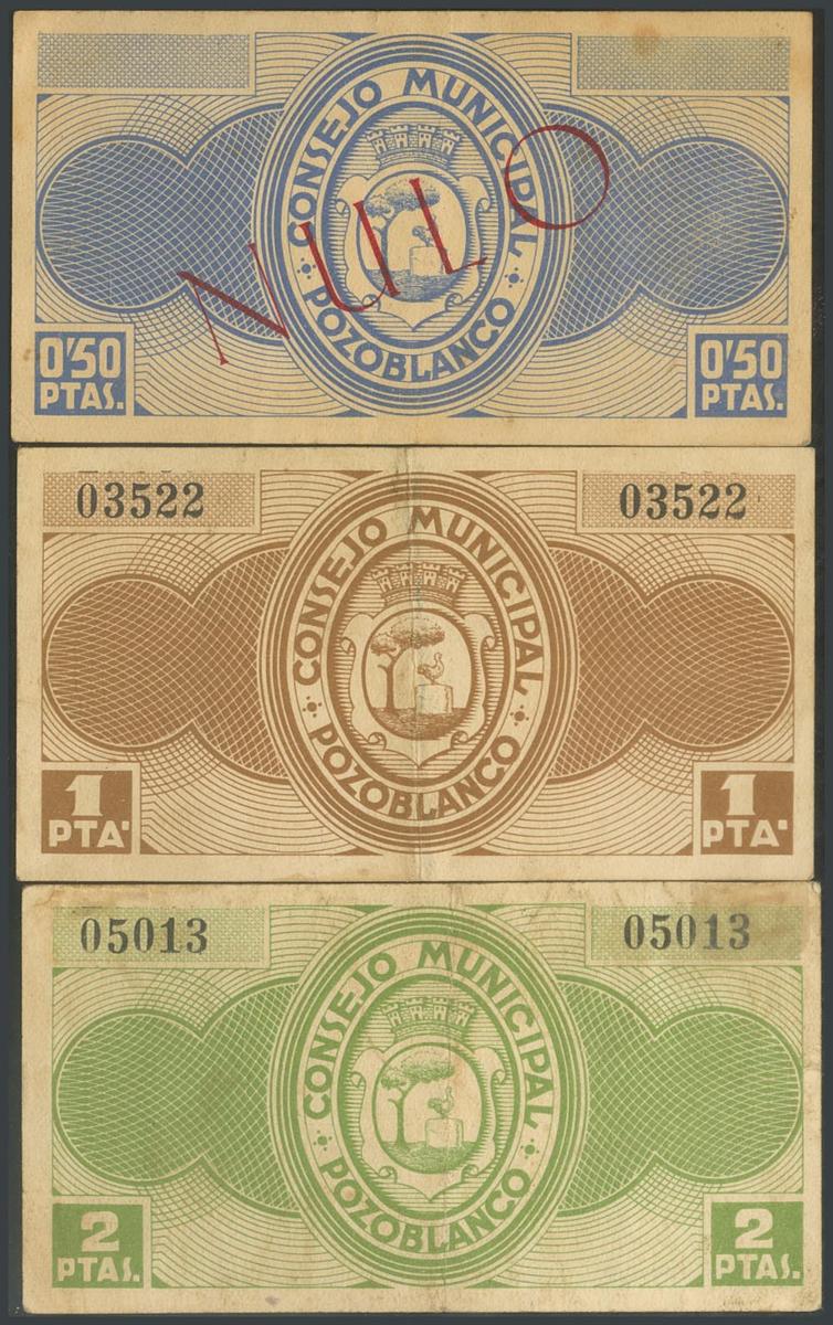 POZOBLANCO (CORDOBA). 50 Céntimos, sello de "NULO", 1 Peseta y 2 Pesetas. 1 de Julio de 1937. Series A, B y C, respectivamente. (González: 4286/88). MBC+.