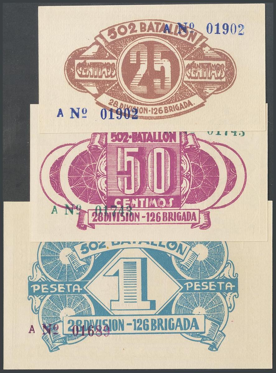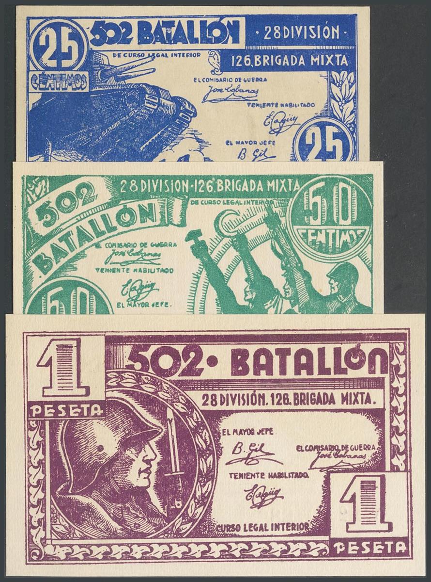 BILLETE MILITAR-502 BATALLON. Serie completa de la Brigada Mixta. 25 Céntimos, 50 céntimos y 1 Peseta. (1937ca). Serie A. (González: 5876/78). Rara. SC.