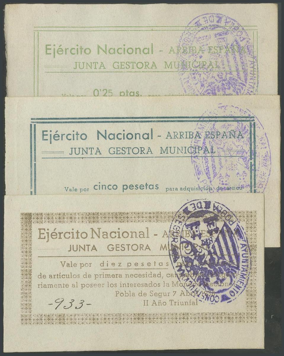 POBLA DE SEGUR (LERIDA). 25 Céntimos, 5 Pesetas y 10 Pesetas. 7 de Abril de 1937. (González: 5930, 5934, 5935). EBC/SC-.