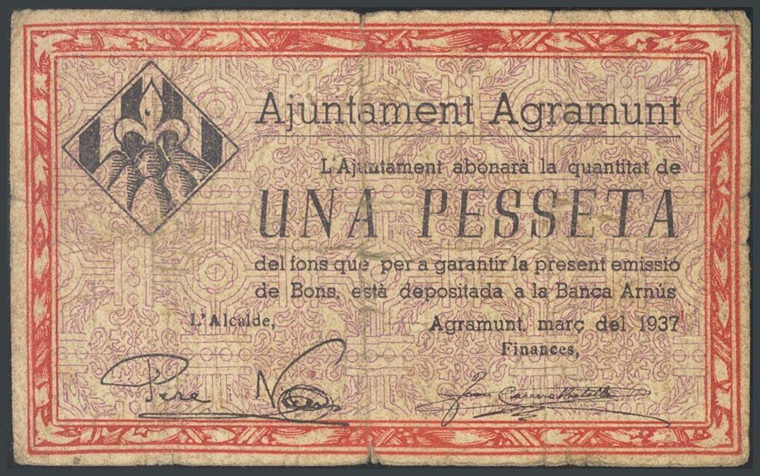 AGRAMUNT (LERIDA). 1 Peseta. Marzo 1937. (González: 6013). MBC-.
