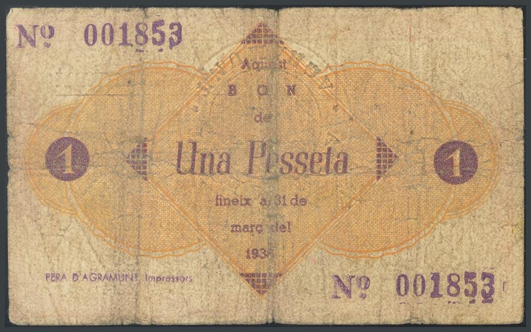 AGRAMUNT (LERIDA). 1 Peseta. Marzo 1937. (González: 6013). MBC-.