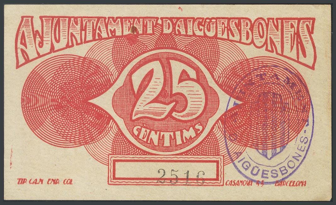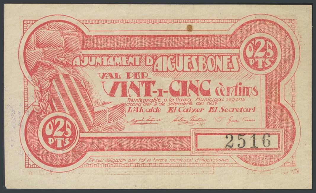 AIGUESBONES (BARCELONA). 25 Céntimos. 2 de Septiembre de 1937. (González: 6048). MBC+.